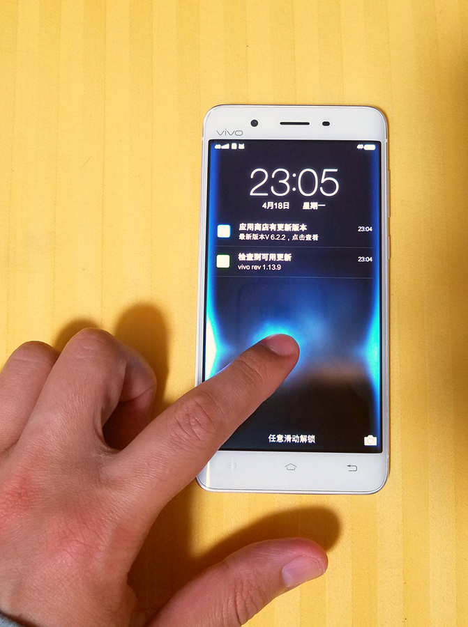 ▲此外,当vivo Xplay5屏幕朝下放在桌面上时,一旦有来电呼入,双曲屏侧面马上就会出现一波一波的光影效果,煞是好看,不过仅限屏幕朝下时才会出现,所以这就有点尴尬了——谁没事会把手机倒扣着,冒着刮伤屏幕的风险,就为了这个酷炫的效果?期待后续会有更实用的功能加入。